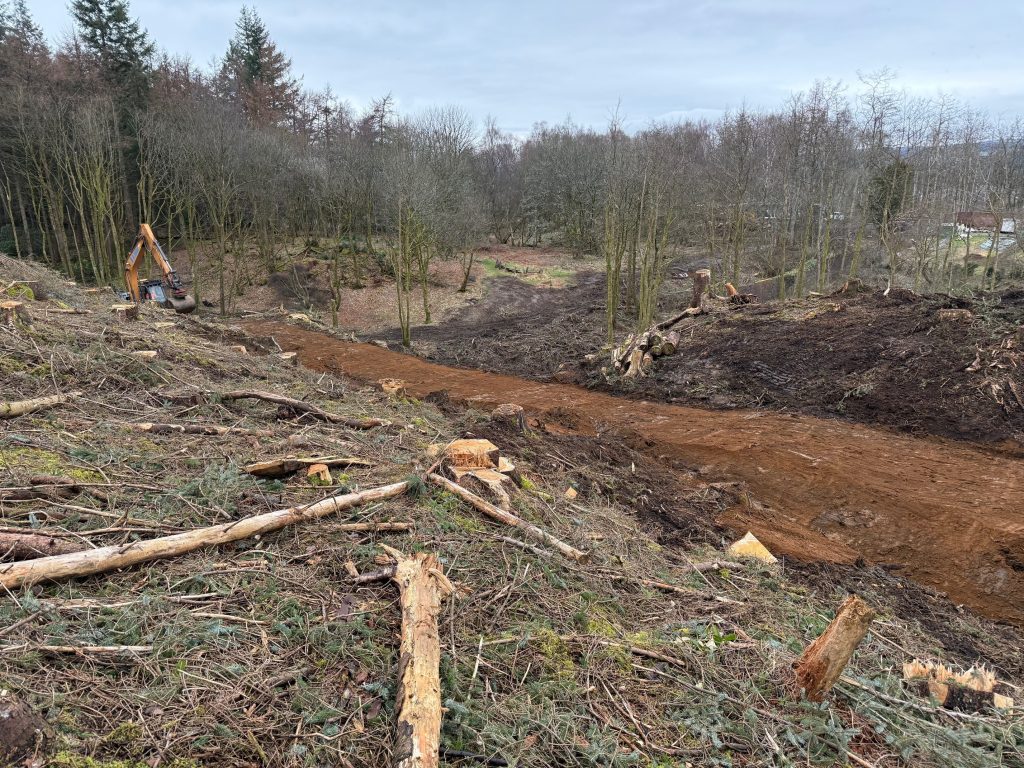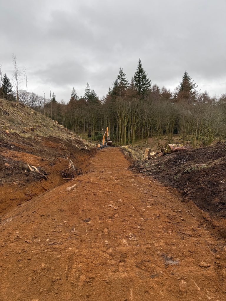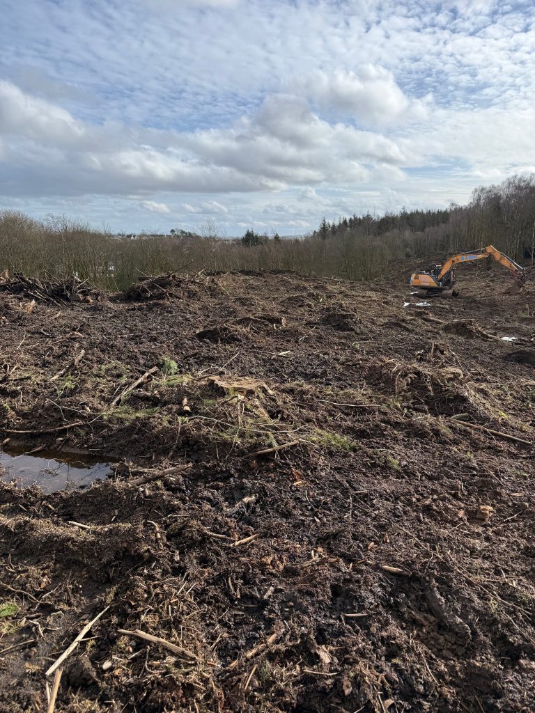 Our groundworks contractor, David Shanks, has now cleared as much ground as possible and consolidated areas of brash into low piles to prepare for replanting later this year.